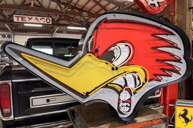 This single-sided reproduction Mr. Horsepower sign displays the character image with red, yellow, and white neon fixtures. It measures approximately 55″ wide by 31″ tall, is wired for 120-volt circuitry, has a black-finished metal frame, and has pre-drilled mounting tabs. Acquired by the selling dealer in 2026, this neon Mr. Horsepower sign is now offered at no reserve with a wood shipping crate in Salem, Oregon.