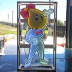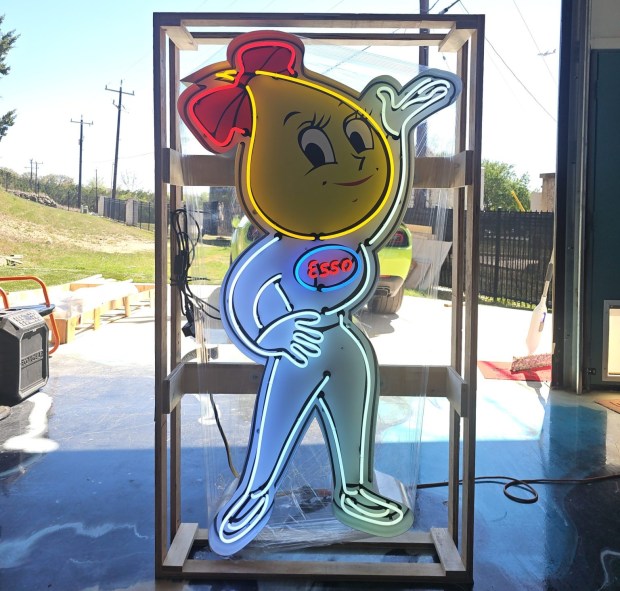 This single-sided Esso character sign is a reproduction piece, and it features Mrs. Drop in multi-color neon tubing using 120-volt circuitry. It measures 68″ tall and 38″ wide, has a metal housing that incorporates pre-drilled mounting brackets, and a power cord with a US-style wall plug. This Mrs. Drop sign is now offered at no reserve in San Antonio, Texas, with a wooden shipping crate.