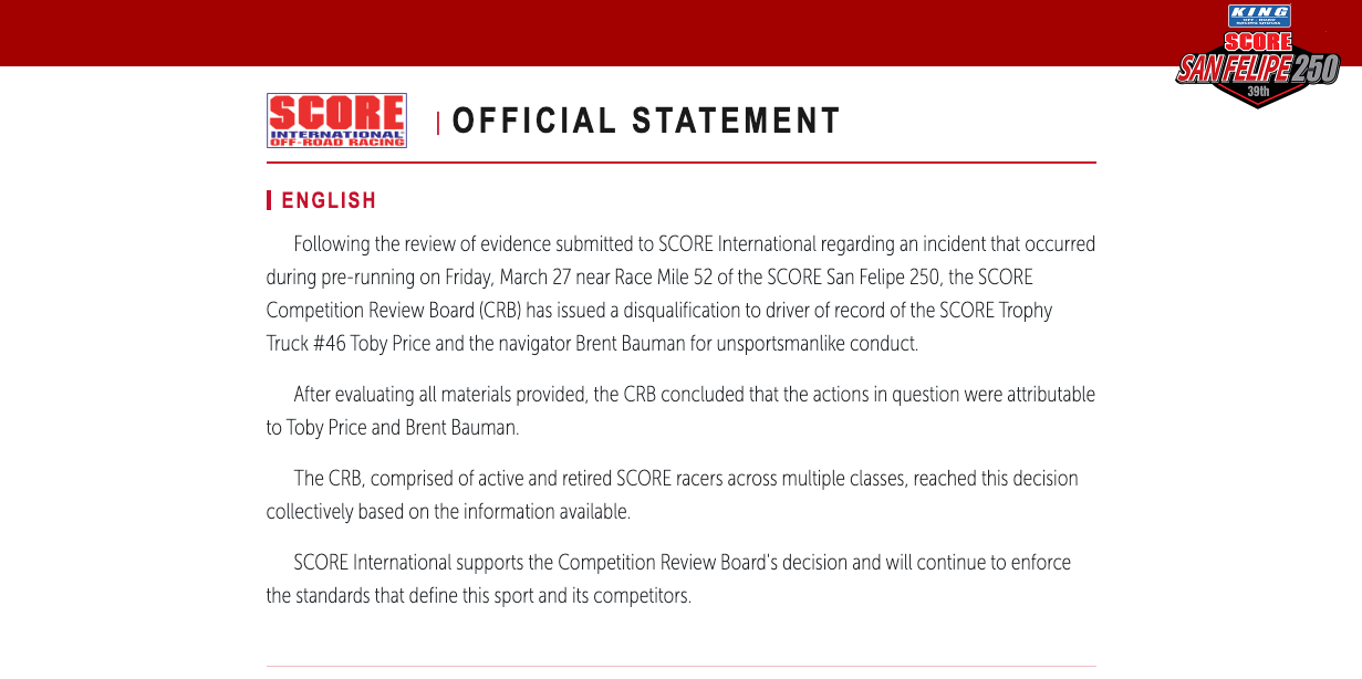 But after evidence came to light that the team had been moving rocks on the course during their prerun, SCORE’s Competition Review Board issued disqualifica …