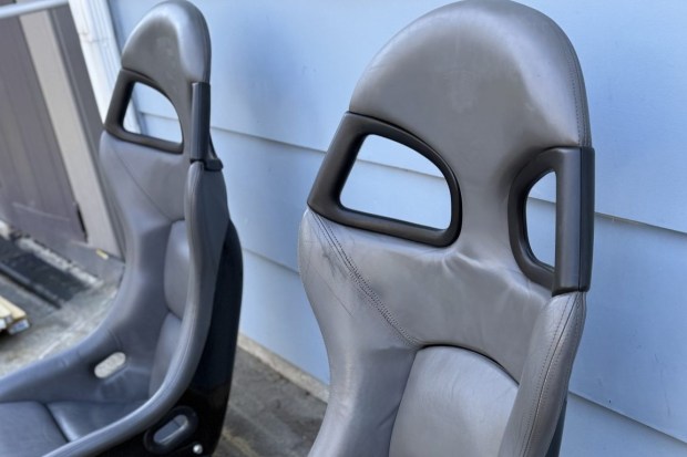 Available as optional equipment for European-market 911 GT3 models, the seats feature a fixed-back design with fiberglass shells. Per the seller, the leather color is Graphite Grey. Porsche crests are debossed on each headrest.