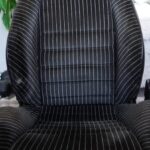 Sport seats feature pronounced bolsters, and these have striped velour seating surfaces and black leatherette on the sides and backs. Manual release levers on the upper sides tilt the backrests forward to allow rear seat access.