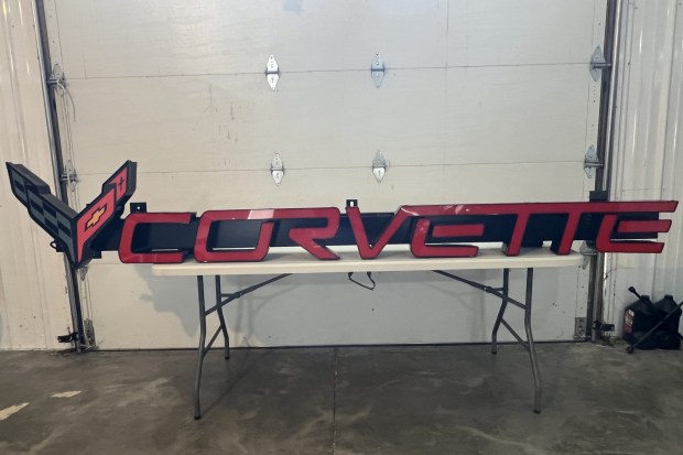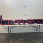 This single-sided sign features the Corvette logo and script lettering in translucent plastic faces in red, black, yellow, and gray. The sign measures approximately 104″ wide by 18″ tall and weighs about 50 pounds.