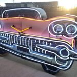The sign depicts the front of a pink Cadillac outlined in two colors of neon tubing powered by a 120-volt cord.