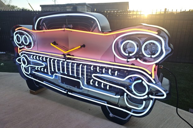 This neon sign features a metal enclosure and face panel depicting the front of a circa 1958 Cadillac accented by neon tubing. The sign measures approximately 68″ wide, 42″ tall, and 7″ deep. Acquired by the seller in January 2026, this neon sign is now offered at no reserve in San Antonio, Texas, with a shipping pallet.