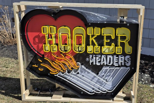 This single-sided reproduction sign displays the Hooker Headers script and heart logo above stylized flame-throwing headers on a black background. The sign uses 120-volt neon fixtures and measures approximately 48″ wide by 36″ tall by 7″ deep and weighs around 50 pounds. Constructed of black-finished metal, the sign enclosure has mounting provisions for hanging. Acquired by the seller in 2025, this Hooker Headers sign is now offered at no reserve in Taunton, Massachusetts, with a wooden shipping pallet.
