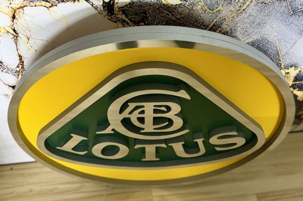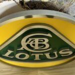 This Lotus sign is a single-sided piece that displays the company name and logo and measures approximately 29.5″ in diameter by 1.5″ deep. The piece features raised aluminum letters inside a triangular logo on a green background, centered on a circular yellow platform with a raised bright-finished border. The monogram features intertwined bright “ACB” letters within a larger “C” and stands for the brand’s founder, Anthony Colin Bruce Chapman. Acquired by the seller in 2022, this Lotus sign is now offered at no reserve in Dundee, Illinois.