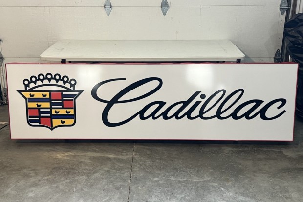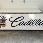 This illuminated reproduction sign was constructed by the seller and displays a prior version of the Cadillac logo. The red and black metal frame houses a translucent panel that covers the internal 120-volt LED fixtures. Completed in February 2026, the sign is now offered at no reserve in Watervliet, Michigan.