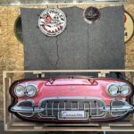 The largest sign features a rendering of the front of a red C1 Corvette with the grille, headlights, and bumperettes outlined in white neon fixtures, and the hood and sign outline accented with red neon tubes. The sign measures approximately 63″ wide, 28″ tall, and 6″ deep and weighs approximately 80 pounds.
