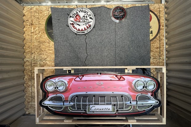 This trio of modern-production display pieces includes a sign rendering the front section of a C1-generation Chevrolet Corvette, a sign with the C1-generation dual-flag logo and make and model wordmarks, and a clock. All three pieces are accented by neon tubing powered by 120-volt cords, and mounting provisions are integrated into each enclosure. This collection is now offered at no reserve in Fort Collins, Colorado.