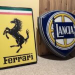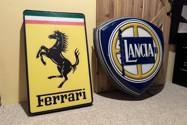 This pair of illuminated signs includes a Ferrari sign that was purchased by the seller in 2022 and removed from the ALGAR Ferrari building, along with a Lancia sign that came from a collection in Italy in January 2026. The internal LED fixtures are powered by 120-volt power cords. These signs are now offered at no reserve in Southbury, Connecticut.