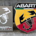 The larger sign has LED fixtures and displays the Abarth shield with a tri-color stripe and the brand’s scorpion logo on a yellow and red background. It measures around 47.5″ wide by 42″ tall by 6″ deep. Bright trim surrounds the shield, and the condition of the piece is shown in the gallery.