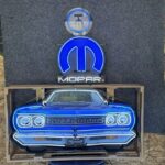 The Mopar sign measures approximately 24″ wide by 24″ tall by 4″ deep and weighs approximately 20 pounds.