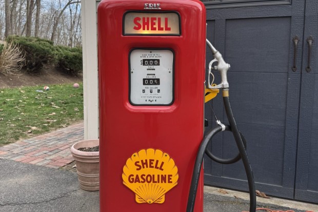 The Pure-branded gas pump was manufactured by Gilbert & Barker Manufacturing of West Springfield, Massachusetts, and was refurbished some time ago under previous ownership. Lexan covers the registers, and one side is unseated from the rubber gasket surrounding the register cover. A hose and noz …