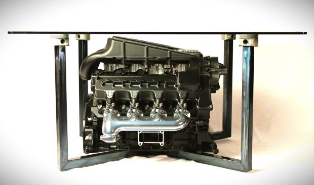 A metal frame that has been heat-treated and clear-coated to subtly shift between blue and purple tones supports the engine. The glass tabletop is supported by four pistons atop the metal frame. The top rises 24″ from the ground and measures 48″ by 36″.