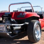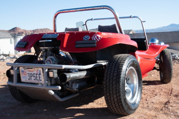 This dune buggy is comprised of a red fiberglass body mounted to a modified Volkswagen chassis, and it was assembled before the seller’s acquisition in 2021. Power is provided by an air-cooled 1.6L flat-four mated to a four-speed manual transaxle, and additional equipment includes an underbody skid plate, rear disc brakes, 15″ alloy wheels, a Weber carburetor, and a dual exhaust system. The body has color-matching sidepods and is accented by a gray-finished bumper and engine cage. Front bucket seats, a rear bench, red and gray upholstery, a touchscreen head unit, and an EMPI shifter have also been specified. This dune …