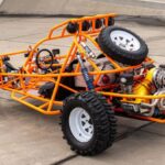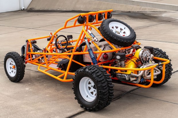 This sand rail is a rear-engined buggy that was assembled under previous ownership and is powered by a 2,110cc flat-four equipped with dual EMPI carburetors, an EMPI oil-breather kit, Scat valve covers, and a Tri-Mil exhaust system. Shifting is through a four-speed manual transaxle. The buggy features an exposed tube frame finished in orange, and the open cockpit houses a pair of fixed-back vinyl-padded bucket seats equipped with RaceQuip multi-point safety harnesses. It rides on Fox shocks and white 15″ EMPI-style steel wheels, and other details include a rear-mounted spare wheel and tire, four-wheel disc brakes, diamond-plate flo …