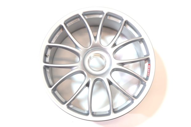 Each wheel features a center-lock design, one-piece alloy construction, and 14 spokes. All four wheels measure 19 inches in diameter, were manufactured by BBS in Germany, and are finished in silver.