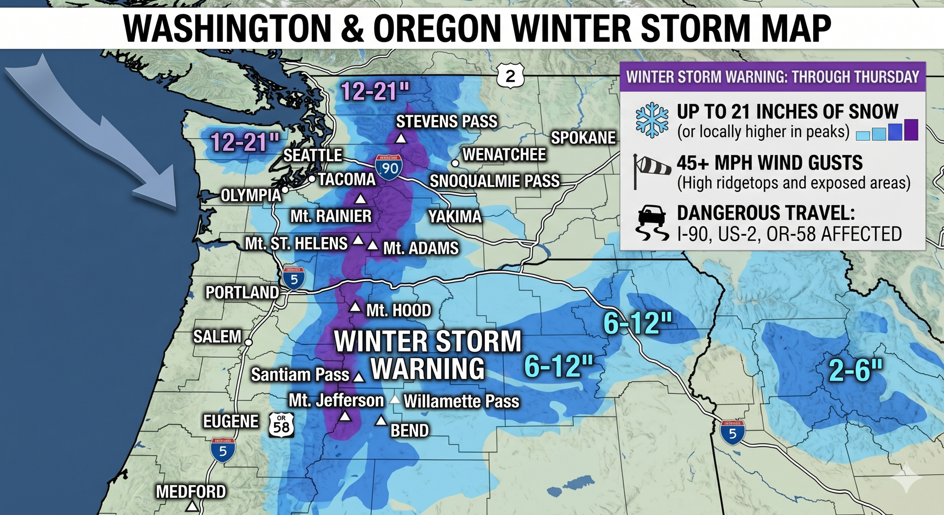 The National Weather Service has Winter Storm Warnings active for the South Washington Cascades and the Northern and Central Cascades of Oregon, plus the East Slopes of the Oregon Cascades. What is heading for the mountains starting this afternoon is not a routine April shower. A deep Pacific trough is pushing cold air and heavy moisture into the range, and the snow level is dropping fast. Totals above 2,500 feet could reach 21 inches from Marion County to Lane County in Oregon, with 6 to 12 inches on the east slopes above 4,000 feet. Wind gusts are forecast at 45 mph across exposed …